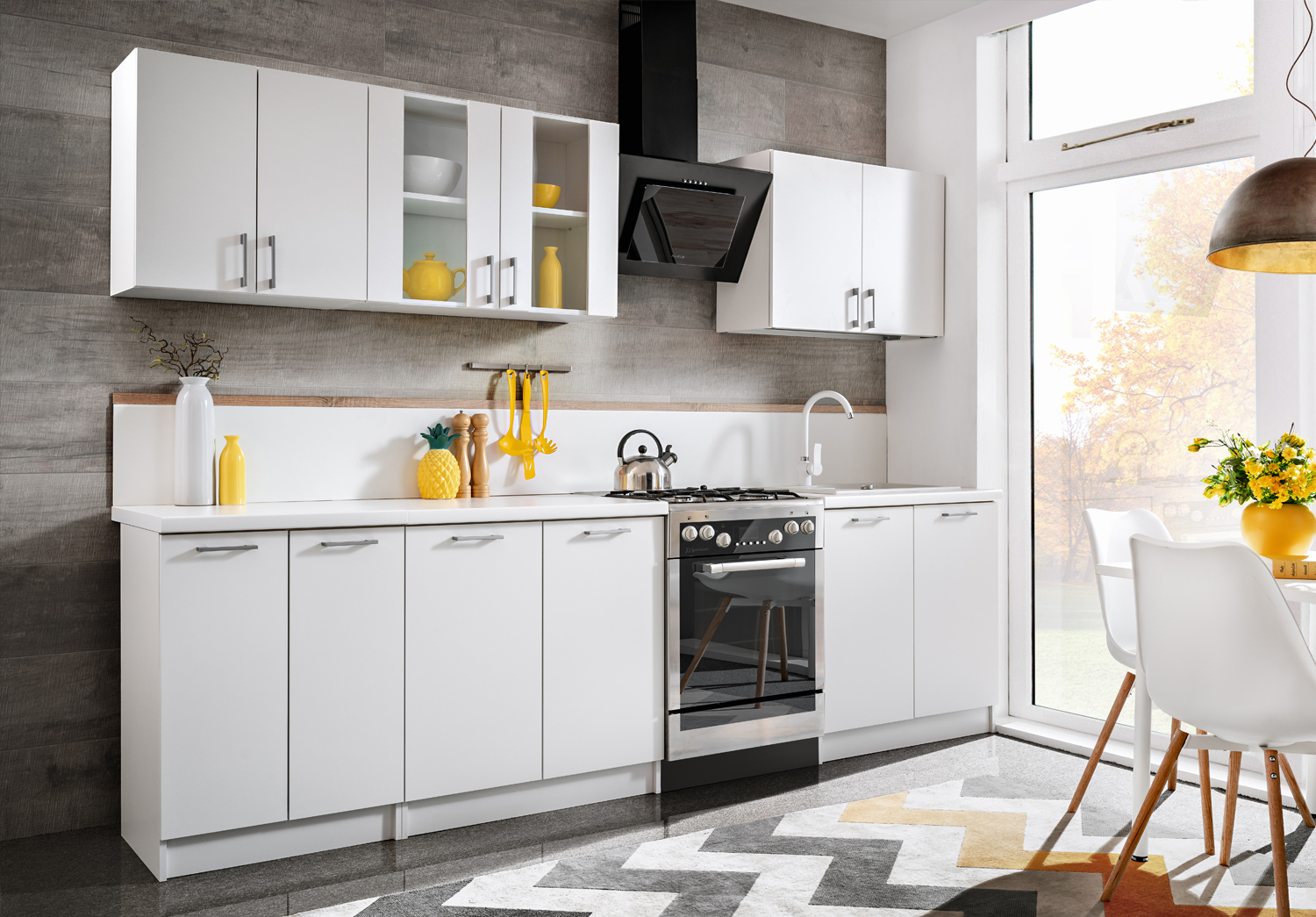 Variante 4: Minimalistische Eleganz – Ein Küchenset komplett in Weiß Hochglanz ist die Quintessenz moderner Designreinheit und erzeugt eine leuchtende, visuell erweiternde Wirkung im Raum.